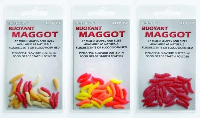 Drennan Buoyant maggot can be used on its own or fished with other baits. The idea is always to balance the weight of the hook and make it easier for carp. tench and big bream to ‘hoover’ up the bait and hook. This consistently produces better. more hookable bites. Pack 27 mixed shapes/ sizes. Pineapple flavour dusted in food grade starch powder – a proven attractant.