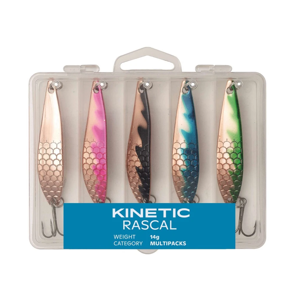 The Kinetic Rascal is a classic fluttering spoon. Works great for rainbow trout, lake trout, perch, pike, zander and salmon. Perfectly balanced with an enticing wobble action. A very versatile mix with well proven classic colours.