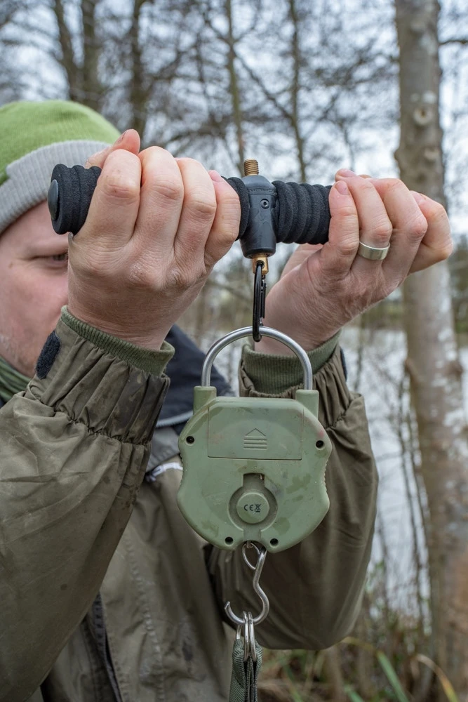 This versatile product is a great compact weigh bar with multiple uses. Can be used as a standard weighing bar, but also features a thread to attach the bar to a landing net handle when pivoting the weigh sling from the ground for a more accurate reading. Complete with strong caribener and soft touch foam.