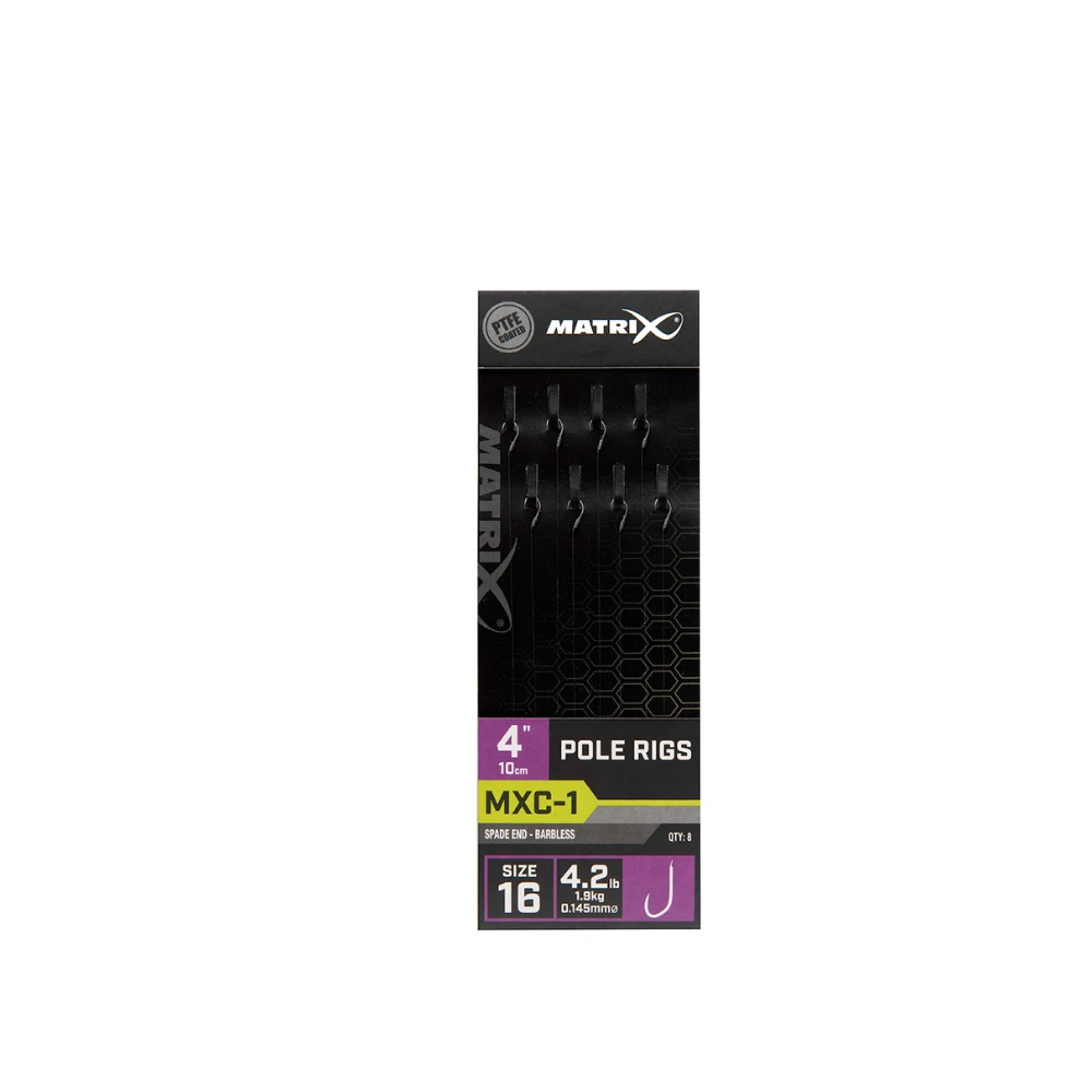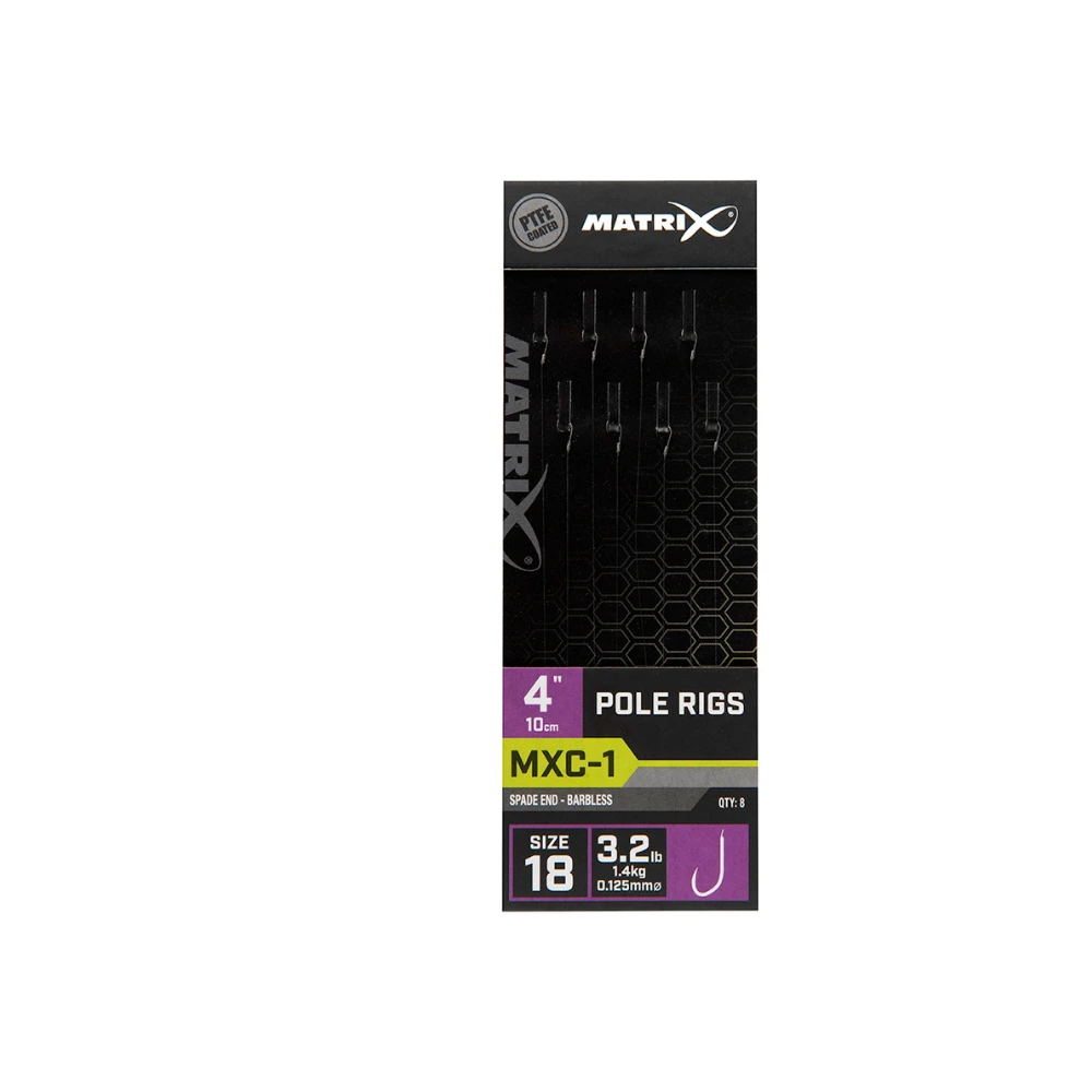 Developed to offer maximum strength when catching big fish on the feeder. Ideal for banding pellets or dumbell boilies. Accurately tied to 4 inches (10cm) which can be securely stored in Matrix hook lengths cases. MXC-4 ultra-strong wide gape PTFE coated hooks. Durable Matrix bait bands tied using Jamie Hughes band in a loop method. Band in the loop gives a better presentation and prolongs the life of the bands. Constructed using Power Micron monofilament.