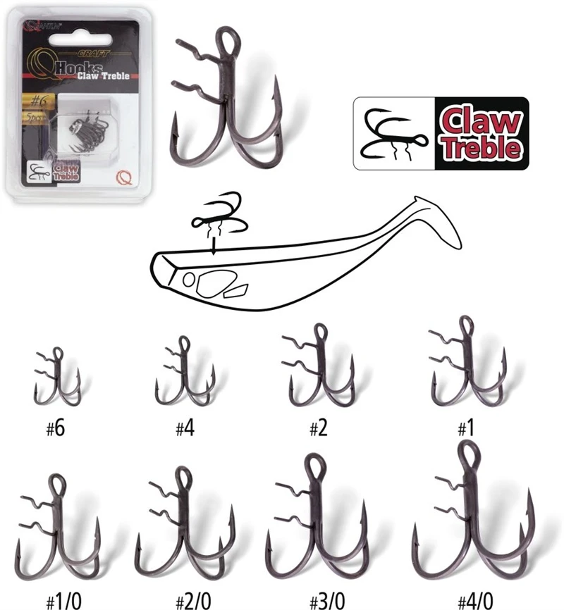 In our Q-Hook assortment there is a very special hook – the first and only treble hook with a baitholder! This special ‘Claw Treble’ is bent in such a way that its claw can be fixed very easily to any part of the soft lure in an optimal way, without damaging the lure or affecting its movement. And the highlight: all three hook tips protrude freely to strike! Bulk packed and available in eight hook sizes from 6 to 4/0.