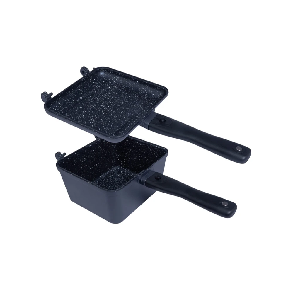 The griddle pan acts as the lid on the deeper pan, and can be detached to become a separate pan, allowing you to cook two lots of food at once. The griddle pan is also interchangeable with the RidgeMonkey Connect Sandwich Toaster Granite Edition.