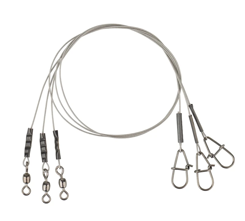Ultra strong, soft and flexible 49 strand stainless steel wire, coated with a strong carbon copolymer, for superb abrasion resistance! Perfect sized swivel and spring steel needle snap, for hard or softlures! The perfect pike trace!
