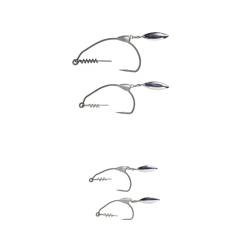 The belly weight balances the loose body lures perfect and the Underspin blade rotates and send out flash. The long and strong cork screw, will hold your soft lure in place perfect and will make the rig last for many headshaking hookups! These ultra sharp wide gape hooks enables you to fish straight thru snags reeds and lily pads!