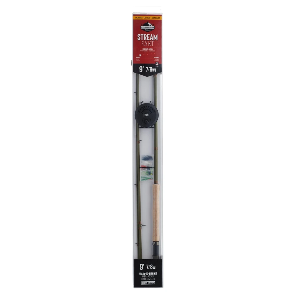 The Shakespeare Cedar Canyon Stream Fly Kits, with models for fresh and salt water, are designed to make your first fly fishing experience simple, successful, and fun. They bring together the fly rods, fully loaded fly reels, and flies in kits that are pre-rigged for your first fish on the fly.